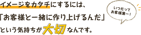 そんなお客様のイメージをカタチにするため、私たちが心掛けているのは、「お客様と共に作り上げるんだ」というのを意識すること。会話やコミュニケーションはもちろん、常にお客様の心や声に耳を傾けながら、工事をすることで、やっとイメージが形作られていくのです。